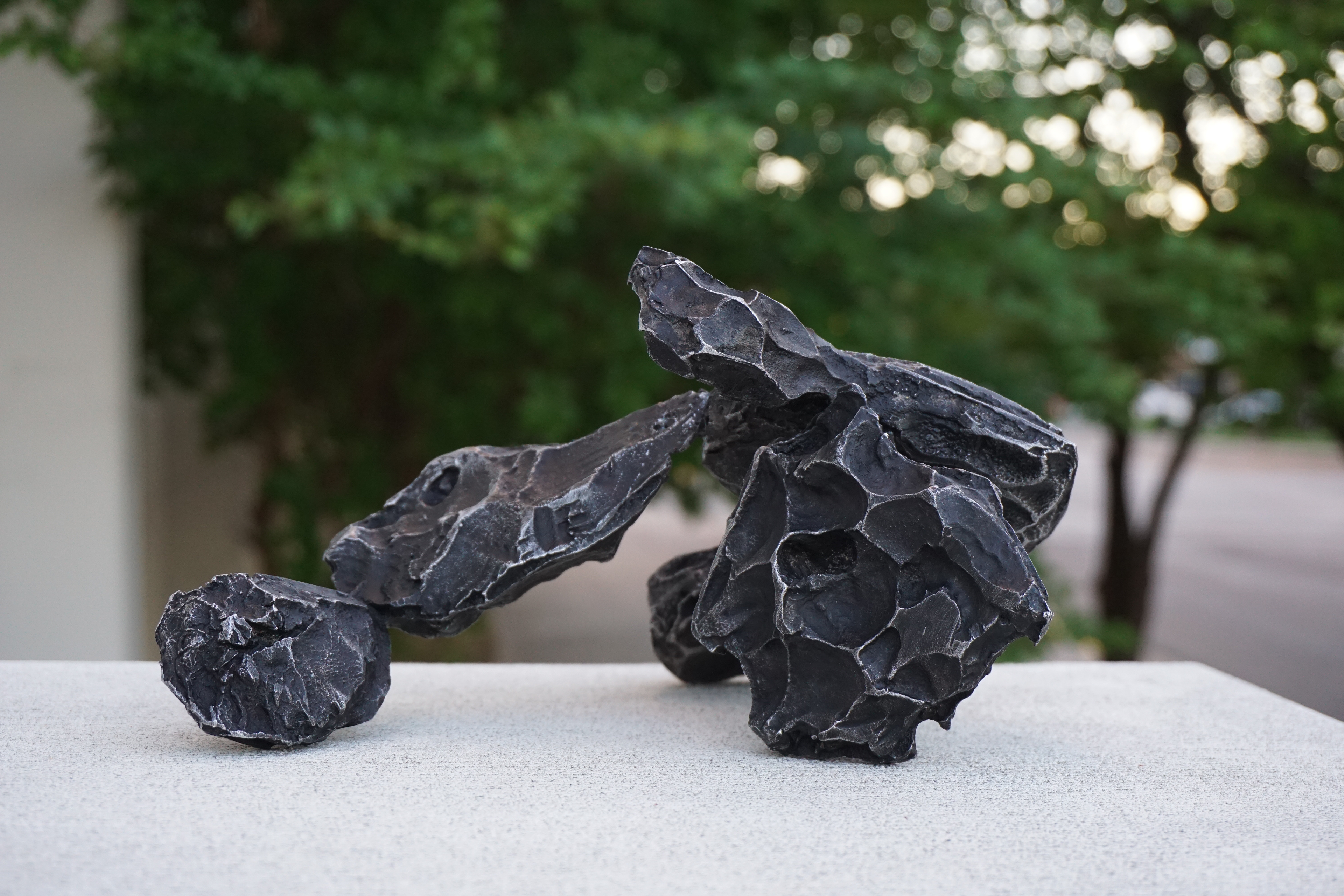 In order for progression to occur, society needs to find a way to work through or with the skeletons of our nature. The abstraction of the cactus, an icon for westward expansion and exploration, is how UNCONFIRMED CACUST responds to this way of viewing our culture via the movement and texture of its form. The metal, rock-like configurations represent not the coldness of individuality, but rather the sturdiness and strength of the collective group. It crawls out of the blackened and forged foundation of ingenuity, not to mock the existing nation, but rather to see its traditions and images through a new light.
